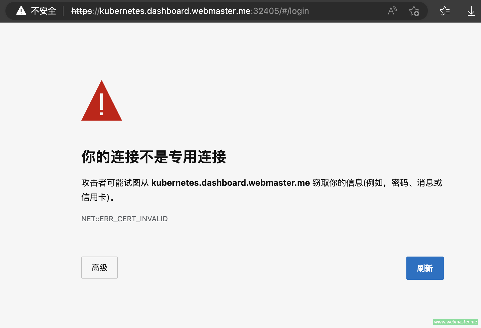 选择“高级”,然后点击“继续前往kubernetes.dashboard.webmaster.me(不安全)”进入,如果没有进入的链接,则用键盘输入“thisisunsafe” 即可正常进入。