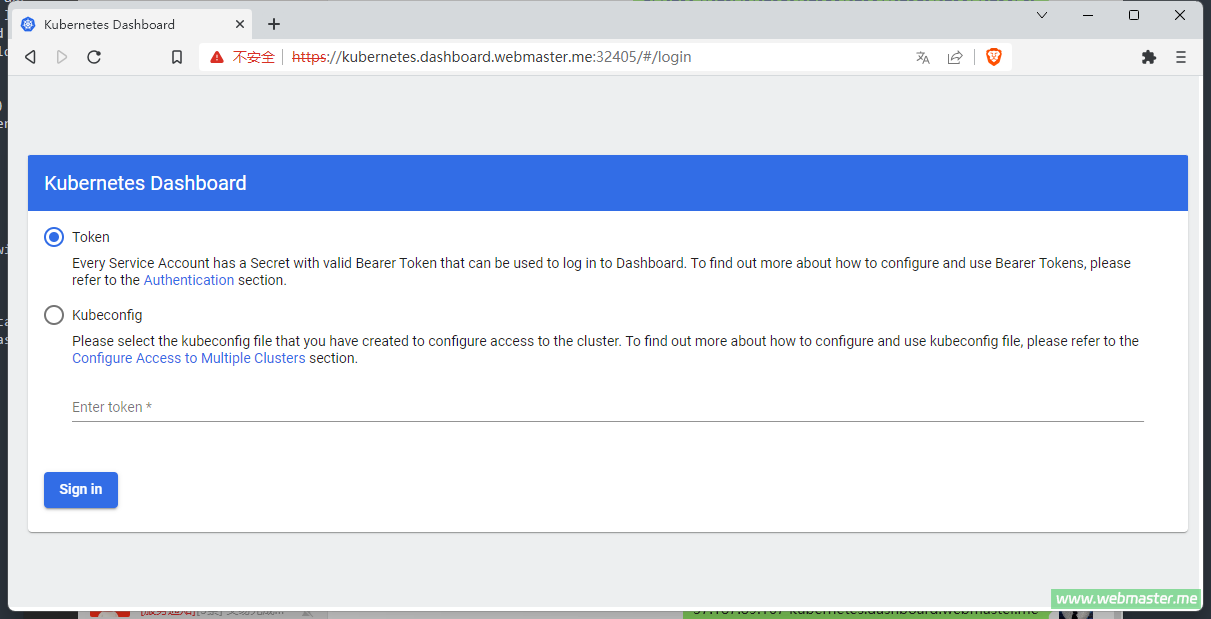 从服务列表里看到kubernetes-dashboard-nginx-controller的web端口是32405。使用浏览器访问https://kubernetes.dashboard.webmaster.me:32405 :